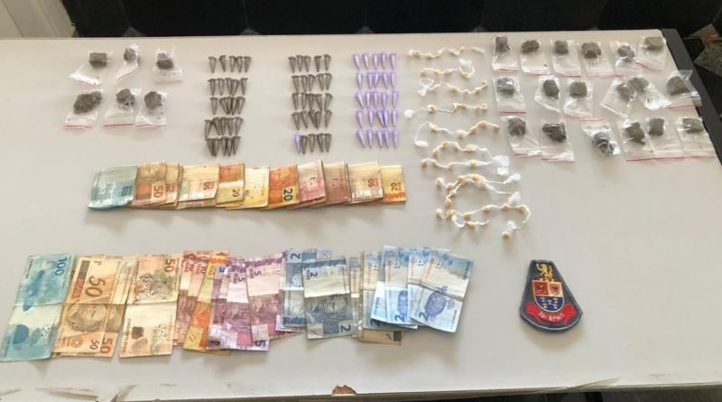 Apreensão total, 24 envólucros de maconha, 75 pinos de cocaína, 48 pedras de crack e R$ 1.905 mil.