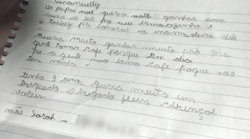 Menina de 8 anos escreve carta para o Papai Noel pedindo leite para irmão mais novo e pão: ‘Tem dia que não tem nada’