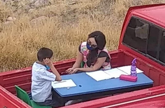 Veja que comovente é a imagem abaixo, professor e aluno na “Sala de aula móvel”, com o aluno prestando atenção e ela o orientando com muito cuidado. Esta caminhonete tem ganhado o coração de muitas pessoas pelo mundo, principalmente os seus alunos que moram em Apaseo el Grande, Guanajuato, México. Este exemplo viralizou nas redes sociais, principalmente no Twitter.