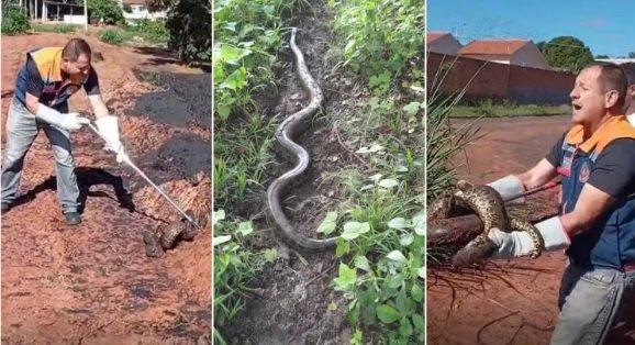 Cobra sucuri de 2,5 metros é capturada em frente a residência em Boa Esperança do Sul