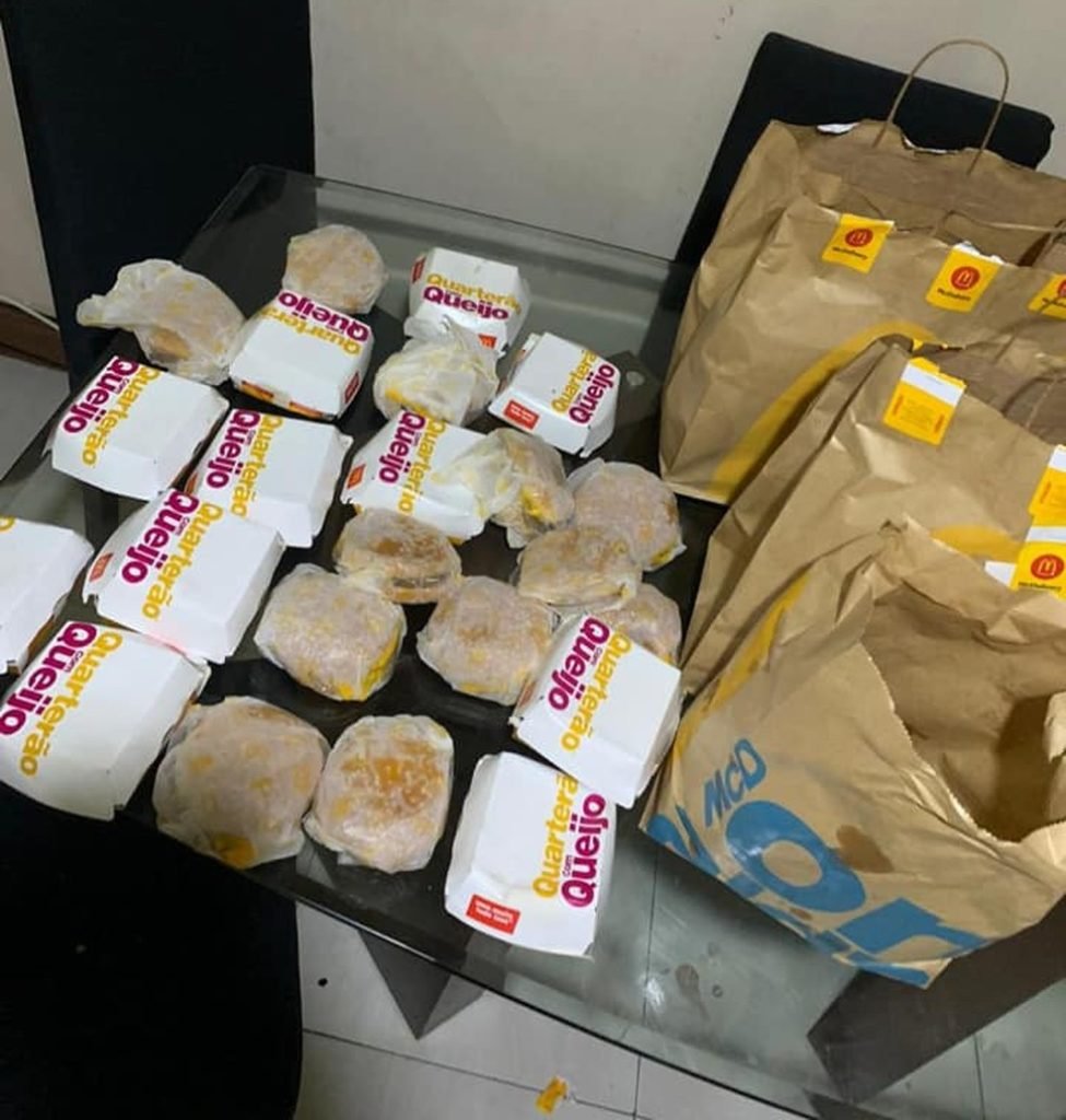 “Na hora eu fiquei p. da vida. Eu queria cancelar o pedido, mas já não dava mais. Ele estava pago pelo cartão de crédito. Ai quando eu pego as bolsas e vejo lá todos aqueles hambúrgueres, eu comecei a rir”, contou Erica, assim que recebeu a encomenda feita pelo filho.