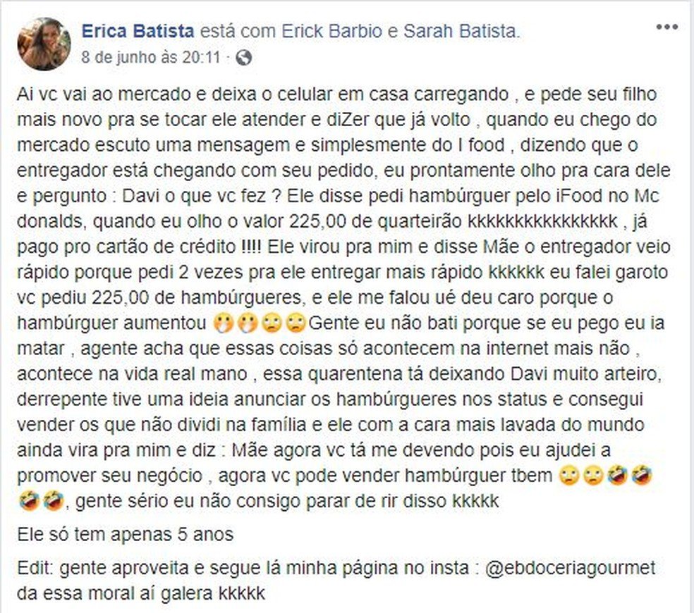 Imagine qual seria a sua reação ao chegar em casa e descobrir que seu filho de cinco anos fez um pedido em um aplicativo de entrega de comida no valor de R$ 225 – tudo em hambúrgueres. Depois da raiva inicial e até de rir da situação, Erica Batista, que mora na Zona Norte do Rio, conseguiu reverter a situação: a travessura do menino acabou servindo de divulgação para seu negócio de venda de doces e bolos.