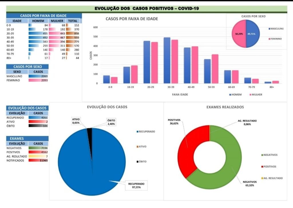 Os dados também apontam que 4.060 pacientes já se recuperaram totalmente da doença, ou seja, 97,55%. A taxa de letalidade – relação entre o número de óbitos e o de casos diagnosticados – está em 2,40%, com 100 mortes. O município REGISTROU um óbito na semana passada.