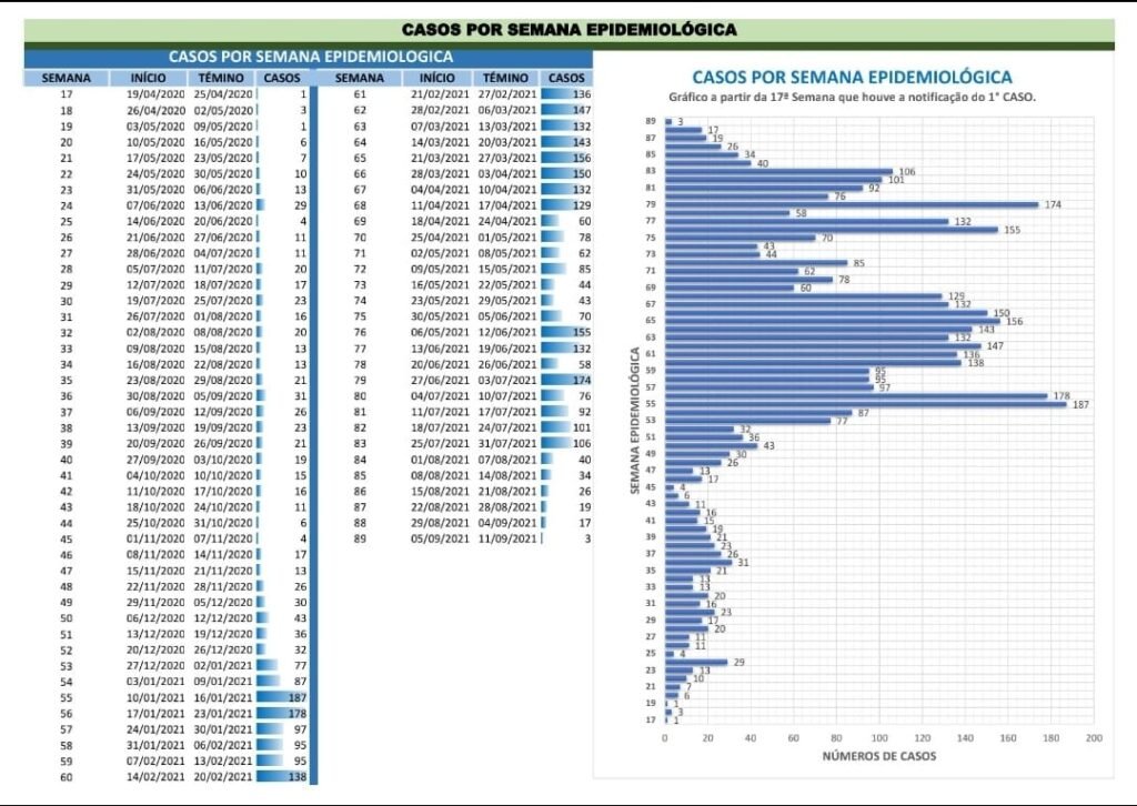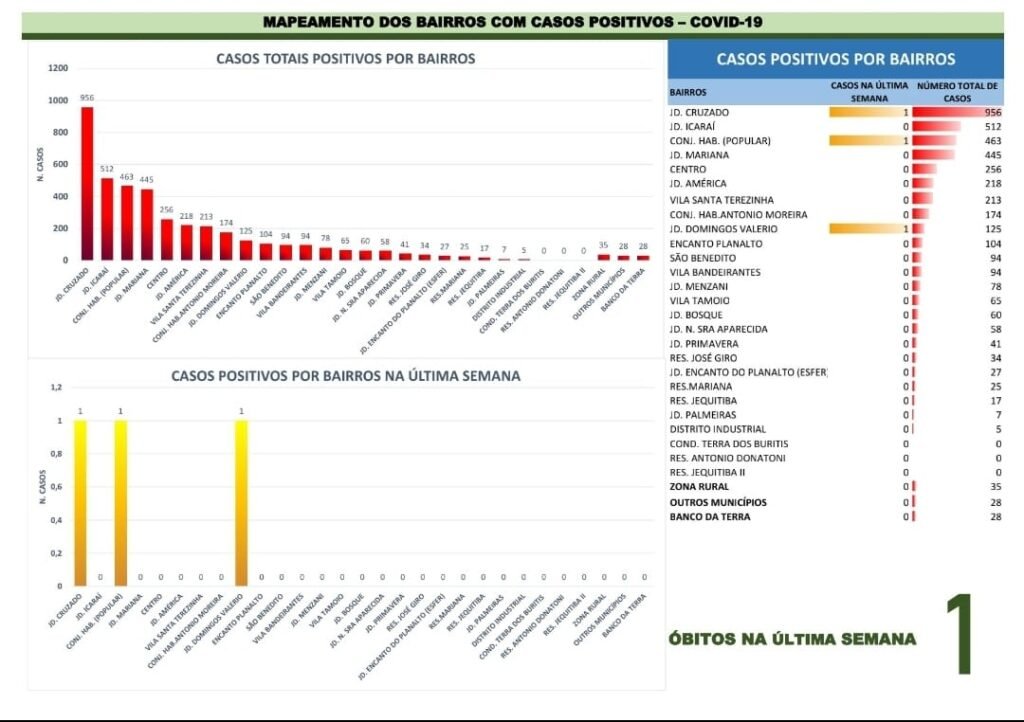 O Boletim Consolidado passou a divulgar a quantidade de casos por semana, registrados em cada bairro. O Jardim Cruzado, Popular e Jardim Domingos Valério registraram, cada um, 01 caso da doença. Os demais bairros não registraram nenhum caso da doença.