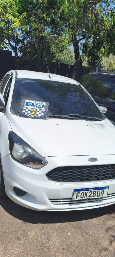 Um veículo Ford Ka, branco, foi identificado como produto de furto/roubo por meio do sistema de monitoramento inteligente Muralha Paulista, que integra câmeras de leitura de placas e dados em tempo real. A informação foi repassada pela Central de Controle Operacional, permitindo a abordagem imediata.