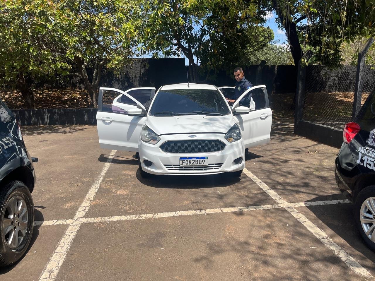 Um veículo Ford Ka, branco, foi identificado como produto de furto/roubo por meio do sistema de monitoramento inteligente Muralha Paulista, que integra câmeras de leitura de placas e dados em tempo real. A informação foi repassada pela Central de Controle Operacional, permitindo a abordagem imediata.