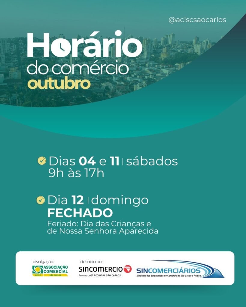 A Associação Comercial e Industrial de São Carlos (ACISC) divulgou nesta segunda-feira, 29, o calendário de funcionamento do comércio para o mês de outubro. A programação foi definida por meio de Convenção Coletiva entre o Sincomercio (Sindicato do Comércio Varejista de São Carlos e Região) e o Sincomerciários (Sindicato dos Empregados no Comércio de São Carlos e Região), bem como, lojistas da cidade.