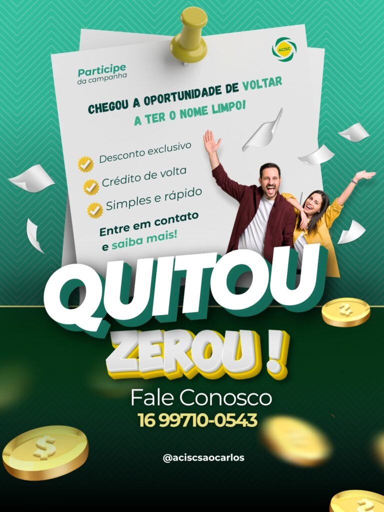 A Associação Comercial e Industrial de São Carlos (ACISC) iniciou neste mês de outubro a campanha “Quitou, Zerou!”, uma iniciativa voltada à renegociação de dívidas com descontos exclusivos que podem chegar a 50%. O objetivo é ajudar consumidores a saírem da inadimplência, retomarem o acesso ao crédito e fortalecer o comércio local.