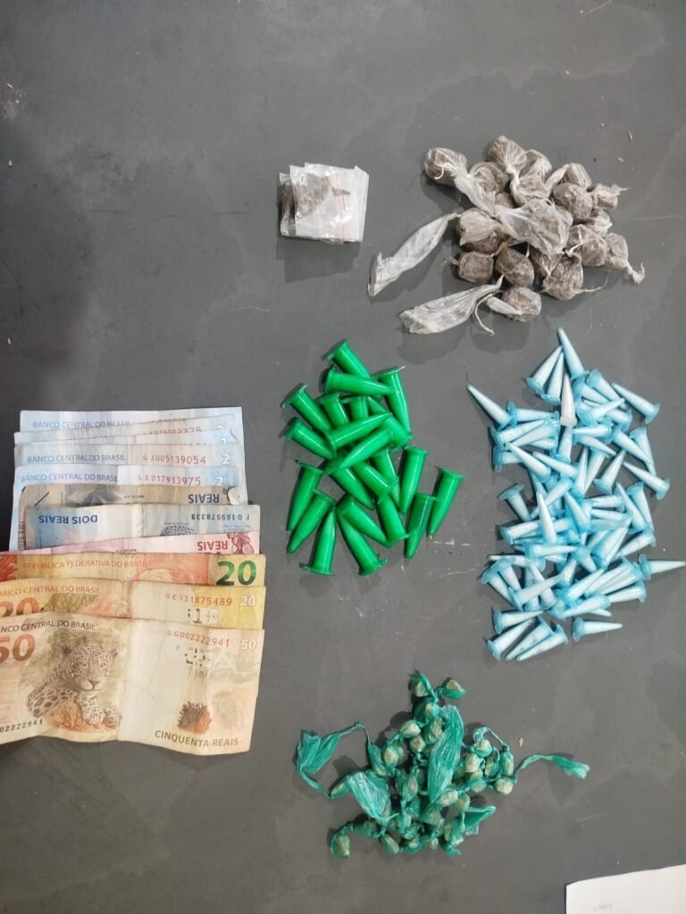 Durante a revista pessoal, foram encontrados com ele R$ 181,00 em dinheiro, além de porções de maconha e cocaína. Questionado, o adolescente admitiu que estava praticando o ilícito e indicou aos policiais onde o restante das drogas estava escondido em um terreno próximo.
