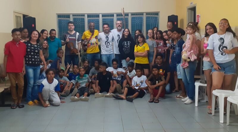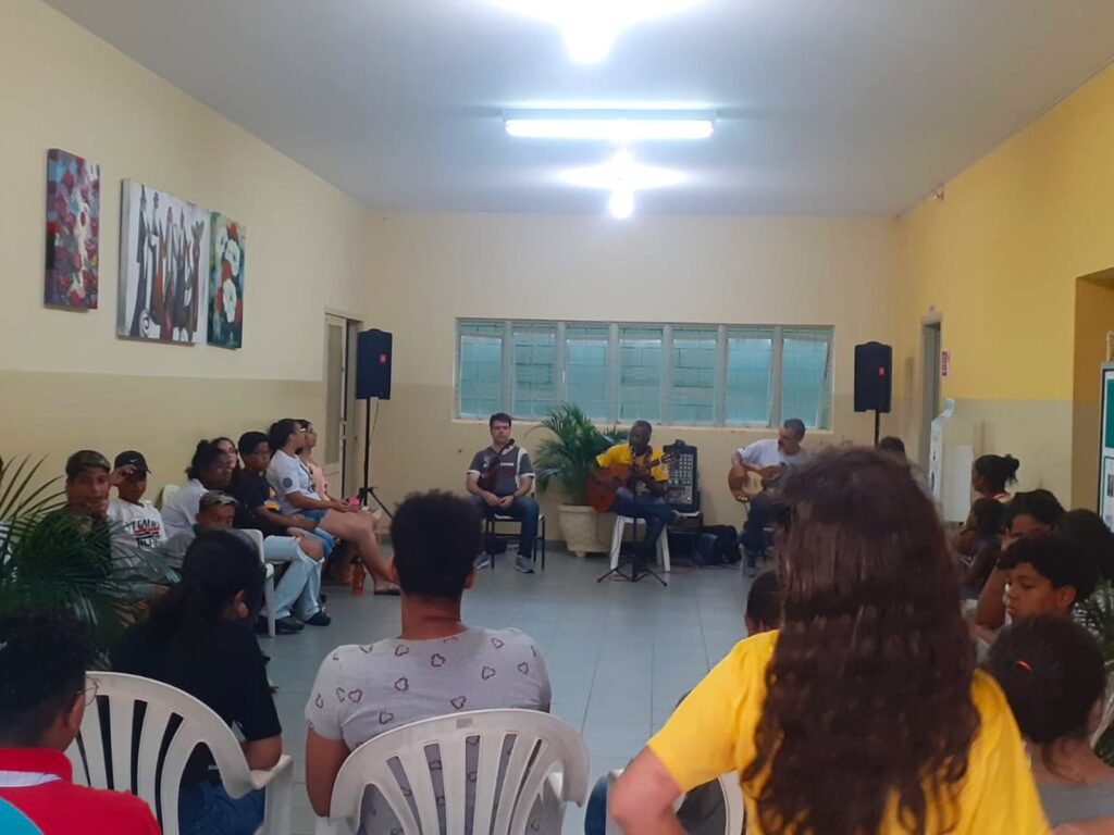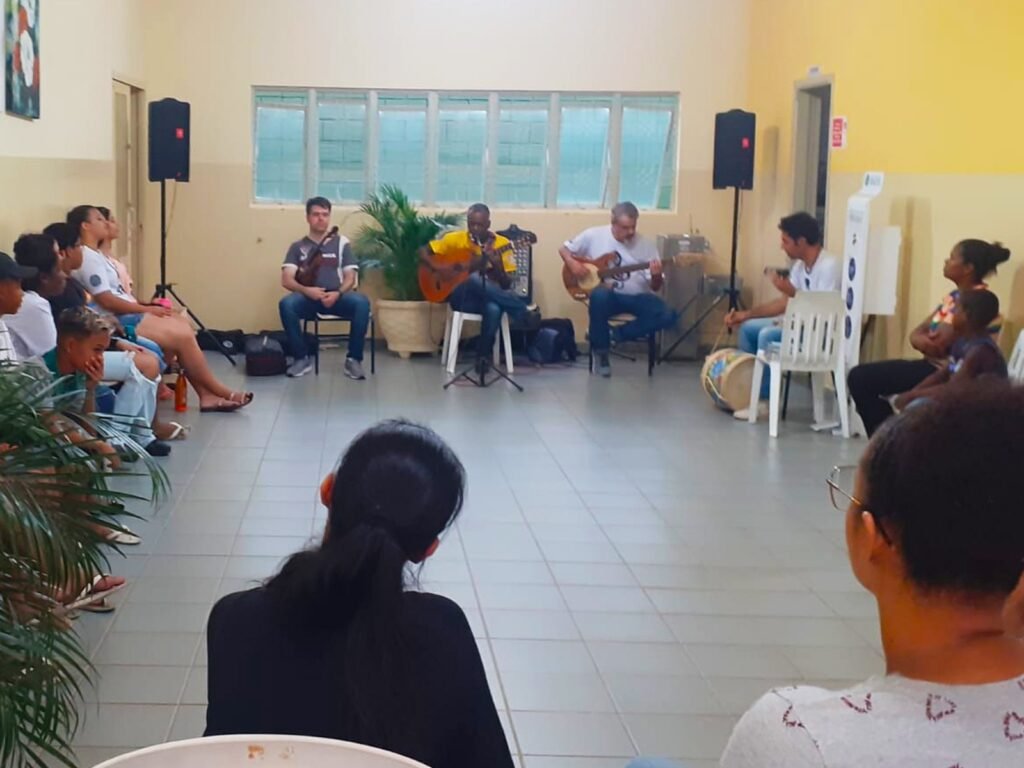 Tanto os alunos de percussão, violão, violino, canto e técnicas vocais, tiveram um momento de imersão musical na aula inaugural com os professores, André de Souza (Canto), Ricardo Finazzi (violão e viola), Misael Sena (violino) e Felipe Cortes (percussão).