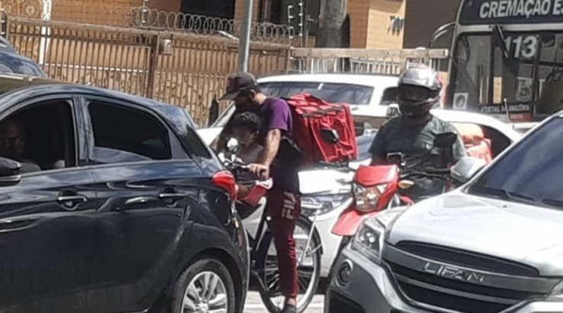 O paraense Alessandro Magno, de 25 anos, está entre os brasileiros que perderam o emprego por causa da pandemia causada pelo novo coronavírus. Como alternativa encontrada para garantir o sustento da família, ele começou a fazer entregas e, sem ter com quem deixar a filha Ana Vitória, de 4 anos, leva a menina na bicicleta para trabalhar nas ruas de Belém, no Pará.