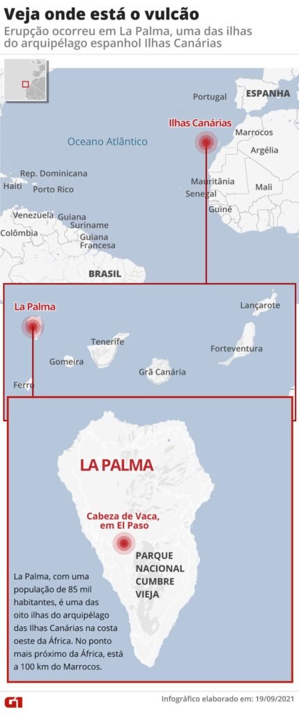 A atual erupção começou em 19 de setembro após uma série de atividades sísmicas – com tremores de terra e terremotos de menor magnitude – ter sido registrada na ilha de La Palma desde o dia 11, segundo o Instituto Geográfico Nacional (IGN) da Espanha.