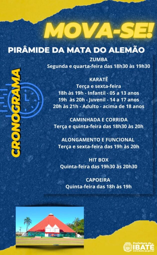 Segundo o chefe de Divisão de Esportes de Ibaté, Raul Seixas II Betune Pereira, desde o mês de agosto a Prefeitura ampliou as atividades desenvolvidas na Pirâmide. ” Quando o assunto é incentivar a prática esportiva e promover a cidadania, a cidade de Ibaté sempre está à frente. De forma totalmente gratuita, a Prefeitura sempre oferece opções de esporte e cultura aos munícipes”, apontou.