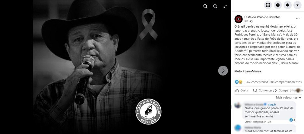 “O Brasil perdeu o tenor das arenas, o locutor de rodeios José Rodrigues Pereira, o ‘Barra Mansa’. Mais de 30 anos narrando a Festa do Peão de Barretos, era considerado um verdadeiro professor para os locutores e respeitado por todo setor… Deixa um importante legado para a história do rodeio nacional. Valeu, Barra Mansa!”, diz a mensagem.