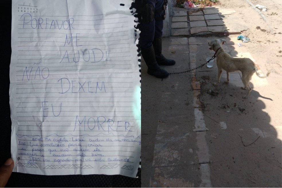 Segundo a Guarda Municipal de Aquiraz, os agentes faziam ronda de rotina quando encontraram a cadela “desnutrida, cheia de carrapatos, amarrada em uma palmeira sob sol forte, sem água, apenas com o bilhete”. No papel, quem escreveu também afirma não ter tido condições para criar o animal. “Eu peço que não deixem ela morrer e cuidem dela bem. Deus vai agradecer por você estar cuidando dela”.
