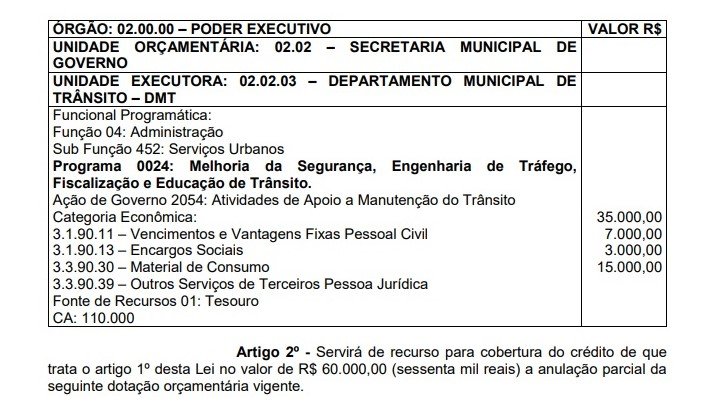 destinados para atender as despesas do Departamento Municipal de Transito – DMT, criado