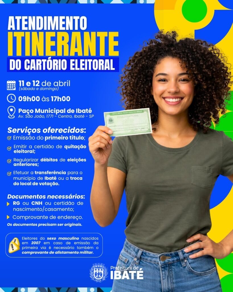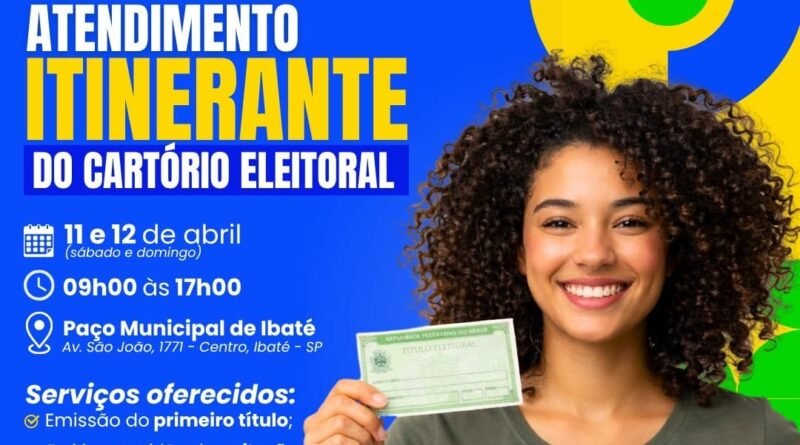 A Prefeitura de Ibaté, por meio da Secretaria de Governo, informa que o atendimento itinerante do Cartório Eleitoral estará disponível no município nos dias 11 e 12 de abril (sábado e domingo), oferecendo diversos serviços essenciais à população.