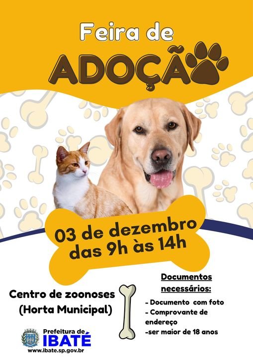 Com o objetivo de aumentar a adoção consciente de animais na cidade de Ibaté, o Centro de Controle de Zoonoses (CCZ) “João Trevizan”, realiza uma feira de adoção, neste sábado (03), das 9h às 14h.