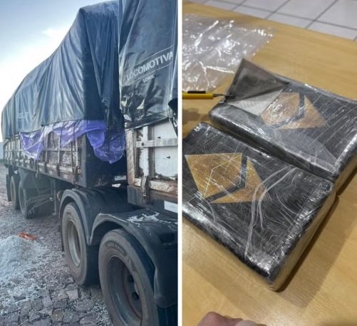 Os policiais realizaram uma busca minuciosa e encontraram dez fardos de cocaína escondidos em uma carga de caroço de algodão, no primeiro semirreboque.