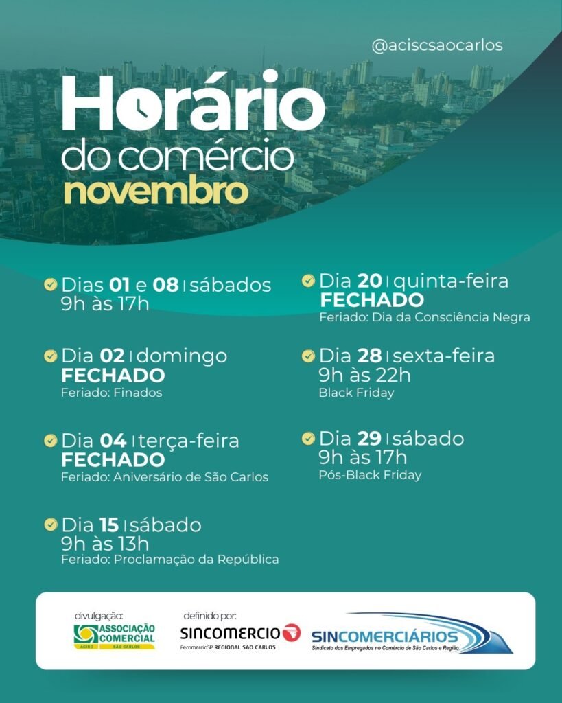 A Associação Comercial e Industrial de São Carlos (ACISC) divulgou o calendário de funcionamento do comércio local para o mês de Novembro, conforme definido pelos sindicatos da categoria (Sincomercio e Sincomerciários) por meio da Convenção Coletiva de Trabalho. A entidade reforça que o horário é resultado de acordo entre os sindicatos e que sua função é apenas divulgar e orientar os comerciantes e consumidores.