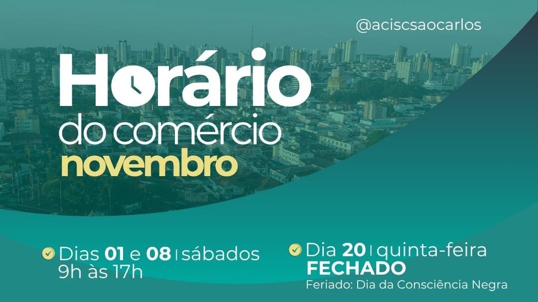 A Associação Comercial e Industrial de São Carlos (ACISC) divulgou o calendário de funcionamento do comércio local para o mês de Novembro, conforme definido pelos sindicatos da categoria (Sincomercio e Sincomerciários) por meio da Convenção Coletiva de Trabalho. A entidade reforça que o horário é resultado de acordo entre os sindicatos e que sua função é apenas divulgar e orientar os comerciantes e consumidores.