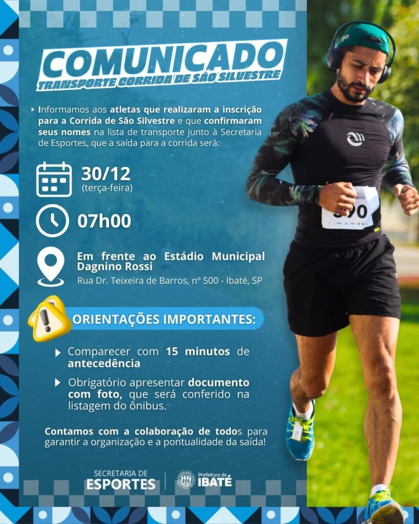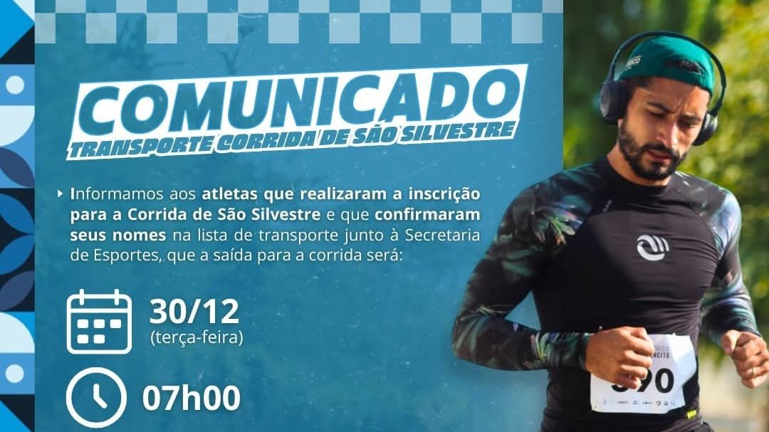 A Secretaria de Esportes informa aos atletas que realizaram a inscrição para a Corrida de São Silvestre e confirmaram seus nomes na lista de transporte que a saída para a corrida acontecerá conforme as orientações abaixo: