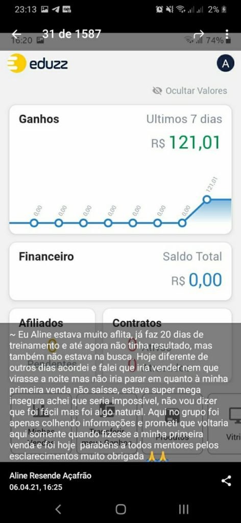 Eeeh logico como todo mundo pensa, eu achei que era golpe, que era mentira, que era tudo enganação, que era pirâmide, enfim, até o momento que eu vi um print (foto) do faturamento dessa minha amiga que em apenas 10 dias conquisto quase 30 mil reais com muito esforço. Foi quando decidi mudar a minha vida. Pensei comigo: