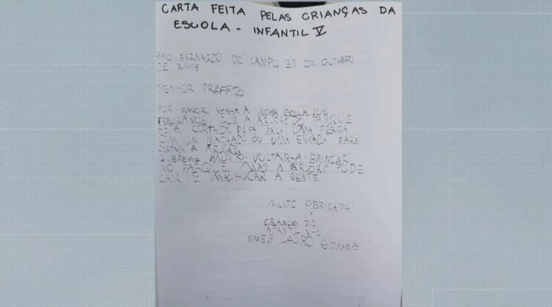 Crianças escreveram carta em 2018 pedindo poda de árvore em parquinho de escola onde menina morreu atingida por tronco