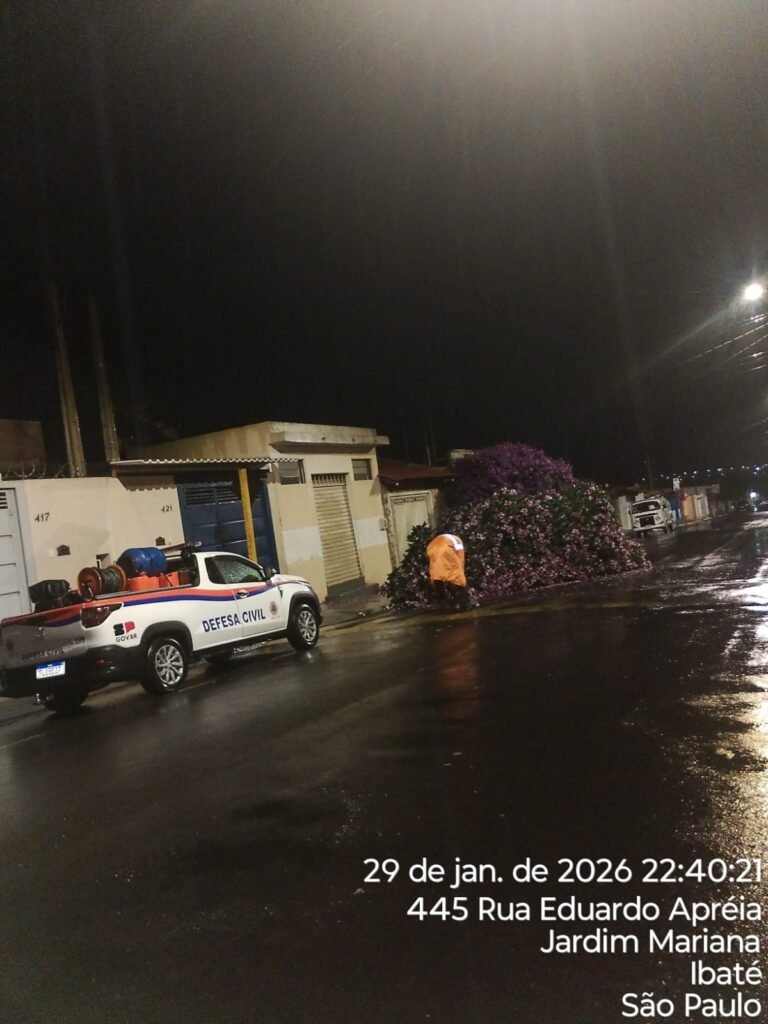 A Defesa Civil de Ibaté realizou, na noite de quinta-feira, dia 29 de janeiro, a retirada de duas árvores que caíram em decorrência da chuva registrada no município. As ocorrências foram registradas nos bairros Jardim Mariana e Jardim Esfer.