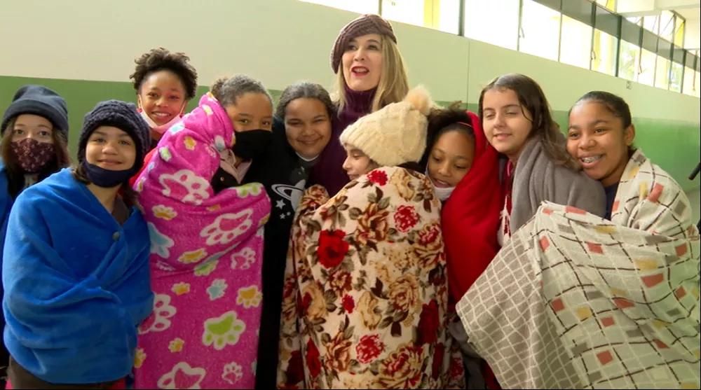 A estudante Lara Faria, de 13 anos, já considera o cobertor parte do uniforme. “Ajuda bastante a gente”, comentou.