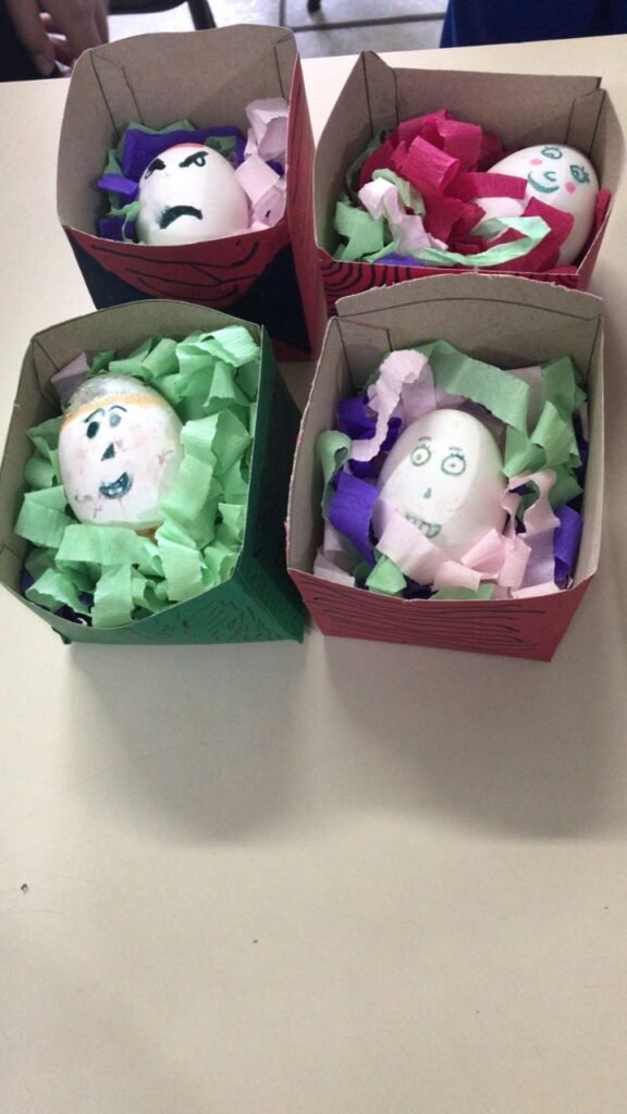 feltro, dinâmica do ovo [onde as crianças tiveram que cuidar do ovo