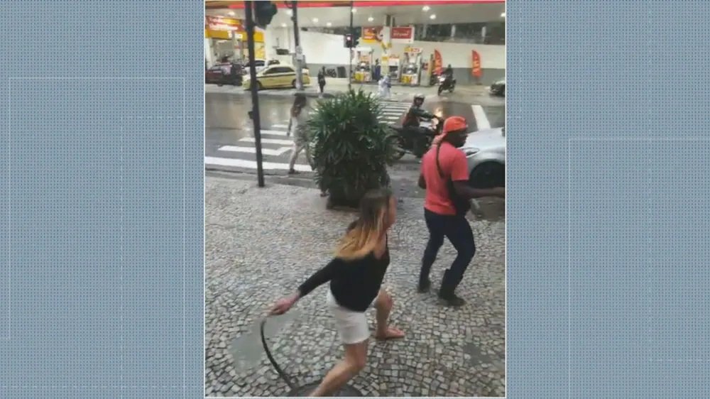 No domingo de Páscoa, Sandra Mathias xingou e agrediu os entregadores Max Angelo e Viviane de Souza, em uma calçada de São Conrado, na Zona Sul do Rio de Janeiro.
