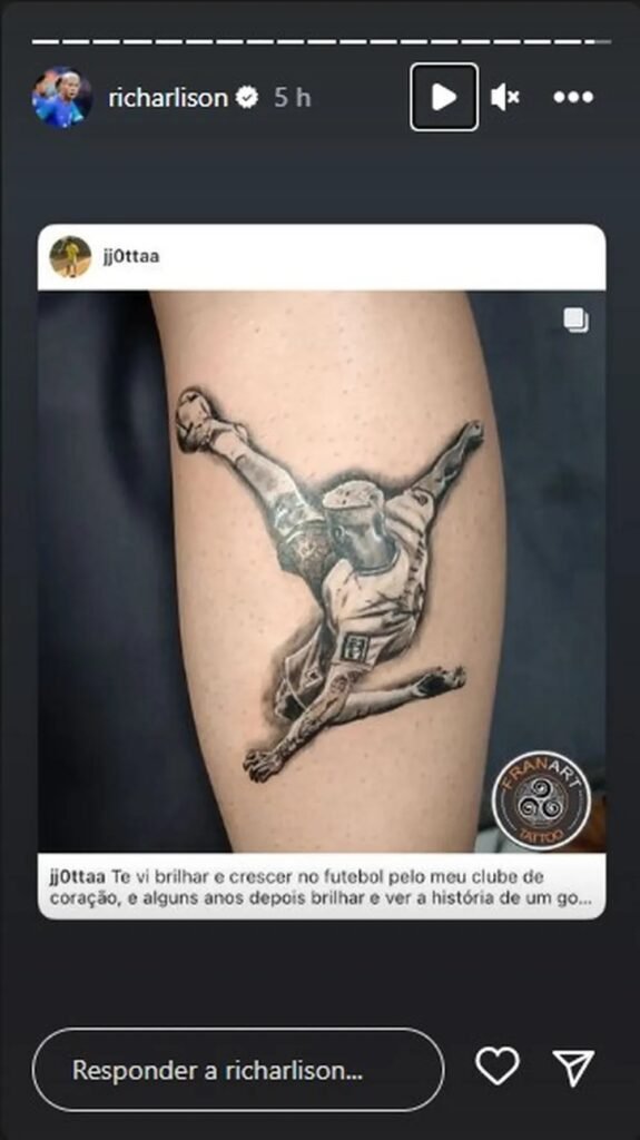 “Eu estava assistindo ao jogo do Brasil quando vi aquele golaço do Richarlison, enxerguei como uma obra de arte e publiquei nos meus stories [do Instagram] como desenho disponível. Queria fazer um desenho do momento que entrou para a história da Seleção Brasileira”, explicou o tatuador.