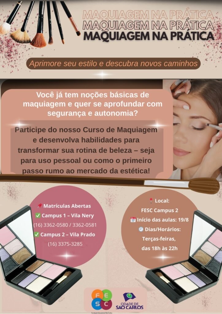 A Fundação Educacional São Carlos (FESC) está com inscrições abertas para o curso “Maquiagem na Prática”, voltado a pessoas com noções básicas que desejam aprimorar técnicas, seja para uso pessoal com mais segurança e autonomia ou como porta de entrada no mercado da beleza.