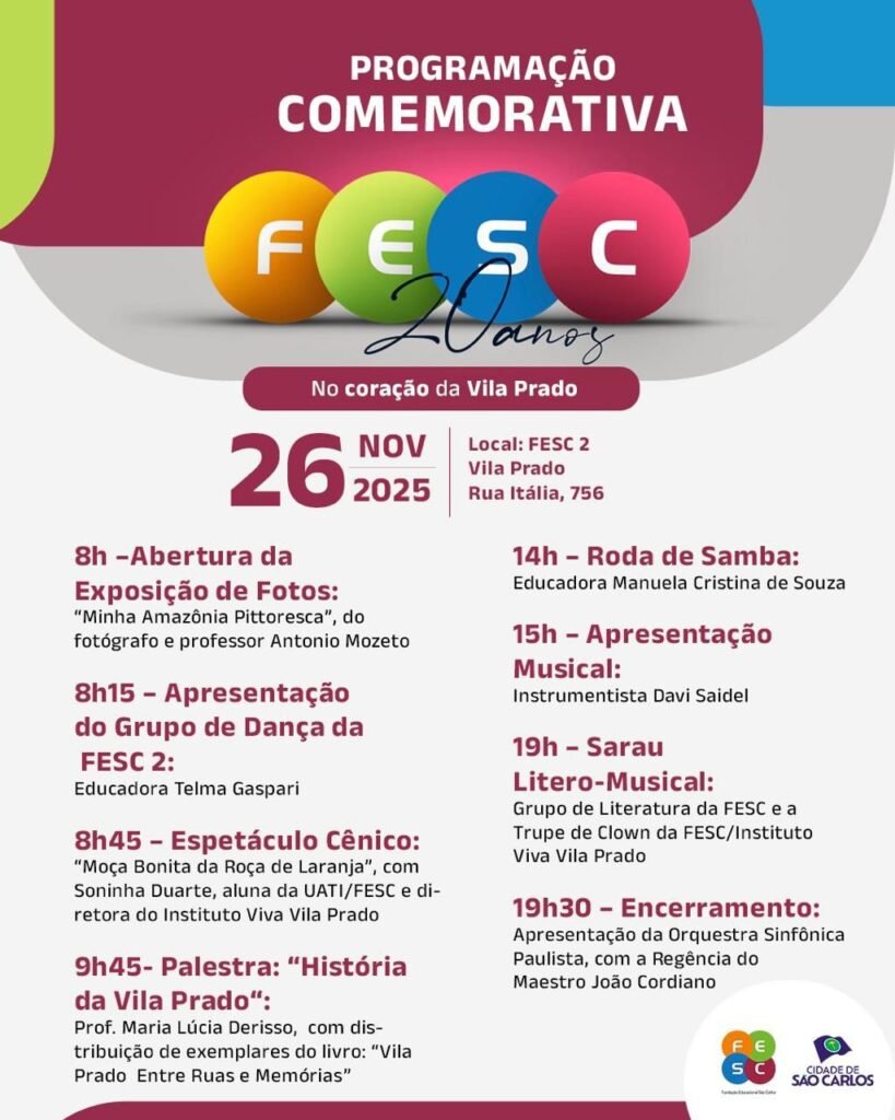 A Fundação Educacional São Carlos (FESC) celebra, no dia 26 de novembro de 2025, os 20 anos da unidade Vila Prado, uma data que representa duas décadas de presença ativa e transformadora na vida da comunidade. Desde sua inauguração, a FESC Vila Prado construiu uma relação de pertencimento com o bairro, tornando-se referência em educação, cultura e memória local. Ao longo desses anos, o espaço se consolidou como ponto de encontro e desenvolvimento humano, oferecendo cursos, projetos, apresentações culturais e ações sociais que fortalecem a cidadania e valorizam a identidade da Vila Prado.