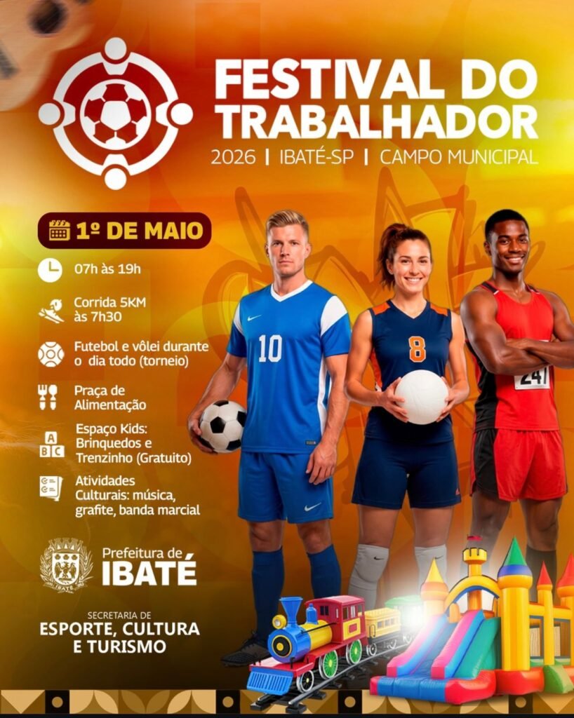 A Prefeitura de Ibaté, por meio da Secretaria de Esporte, Cultura e Turismo, realizará no dia 1º de maio o Festival do Trabalhador 2026, um evento especial preparado para celebrar a data com uma programação diversificada voltada para toda a família.