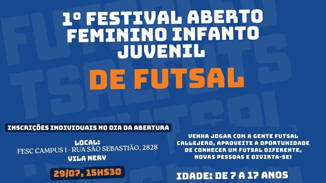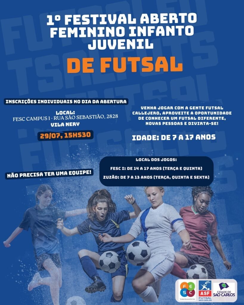 As inscrições são gratuitas e realizadas presencialmente no local, no momento da abertura. O festival será realizado na FESC, localizada na Rua São Sebastião, 2.828, na Vila Nery, e está aberto para meninas de 7 a 17 anos.