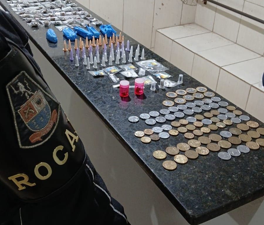 Durante a busca pessoal, os policiais localizaram na sacola uma grande quantidade de substâncias entorpecentes, além de moedas em seus bolsos. Questionado, o suspeito confessou que atuava como “vapor” no tráfico local, sendo responsável pela venda direta das drogas nas ruas. Segundo ele, o turno de trabalho começou às 07h00 e terminaria às 19h00, com pagamento de R$ 400,00 por dia.