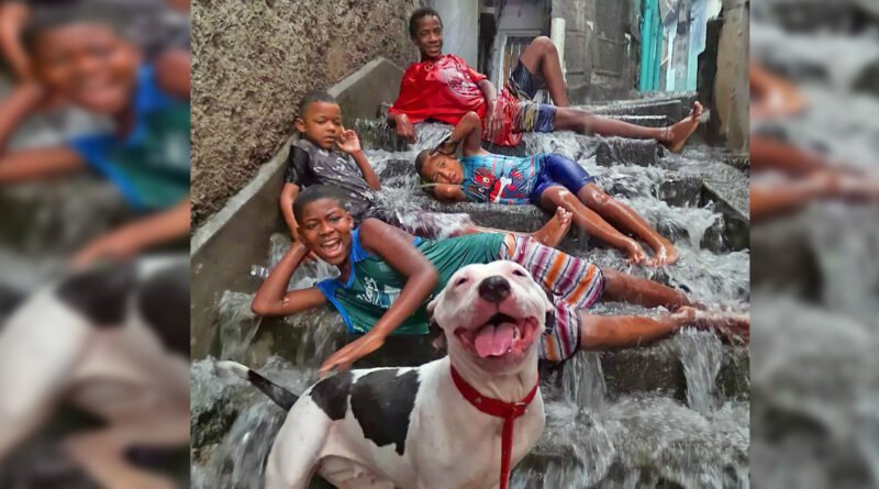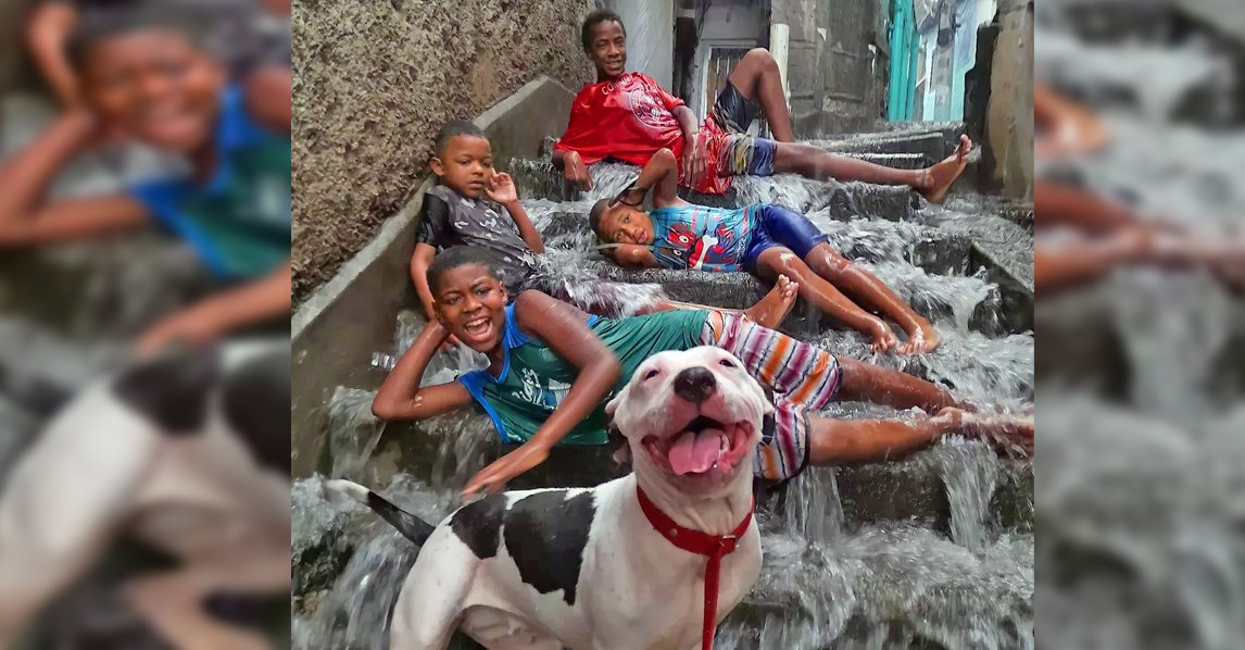 Foto de crianças na chuva e cachorro sorrindo em comunidade do Rio viraliza