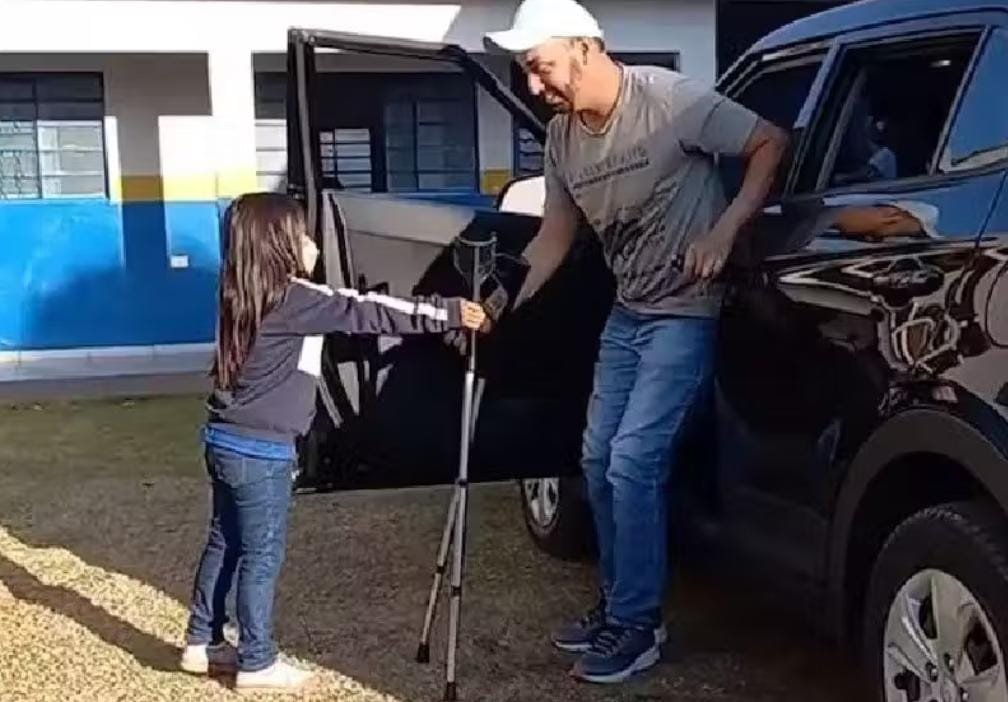 Gentileza: menina de 5 ajuda professor com muleta a descer do carro todo dia