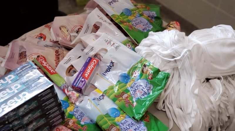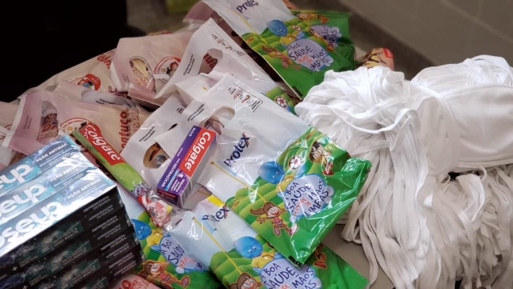 limpador de língua, enxaguante bucal e escova dental. A doação dos kits