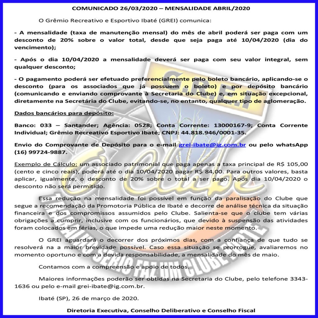 O Grêmio Recreativo e Esportivo Ibaté (GREI) comunica: – A mensalidade (taxa de manutenção mensal) do mês de abril poderá ser paga com um desconto de 20% sobre o valor total, desde que seja paga até 10/04/2020 (dia do vencimento); – Após o dia 10/04/2020 a mensalidade deverá ser paga com seu valor integral, sem qualquer desconto; – O pagamento poderá ser efetuado preferencialmente pelo boleto bancário, aplicando-se o desconto (para os associados que já possuem o boleto) e por depósito bancário (comunicando e enviando comprovante à Secretaria do Clube) e, em situação excepcional, diretamente na Secretária do Clube, evitando-se, no entanto, qualquer tipo de aglomeração. Dados bancários para depósito: