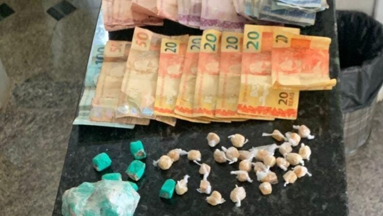 Foram apreendidos 416 reais, 100 tabletes de maconha, 29 pedras de crack e 1 pino de cocaína.