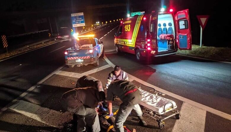 O acidente ocorreu na junção com a alça de acesso com a rodovia SP-215. O motorista da carreta ainda tentou desviar, mas acabou atingido o pedestre que aparenta ser andarilho.