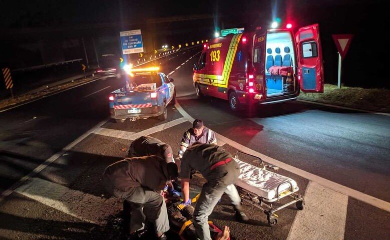 O acidente ocorreu na junção com a alça de acesso com a rodovia SP-215. O motorista da carreta ainda tentou desviar, mas acabou atingido o pedestre que aparenta ser andarilho.