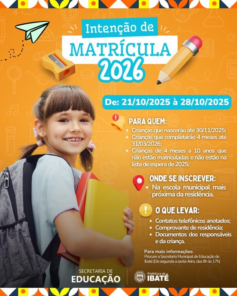 A Secretaria Municipal de Educação de Ibaté informa que está aberto o cadastro de intenção de matrícula para o ano letivo de 2026 na Rede Municipal de Ensino. A iniciativa é destinada a crianças, jovens e adultos que estão fora da escola e desejam ingressar na rede municipal no próximo ano.