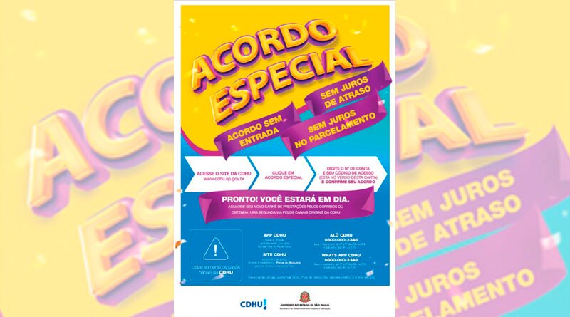 O mutuário receberá um código de acesso (seis dígitos) e acessando o site da CDHU (www.cdhu.sp.gov.br), informando o número da conta/contrato mais o código fornecido, será disponibilizado o melhor acordo possível, dividindo o débito até o final do contrato, respeitada o valor da parcela mínima de acordo de 5% do salário mínimo atual: R$ 65,10, que será acrescentada a prestação mensal.