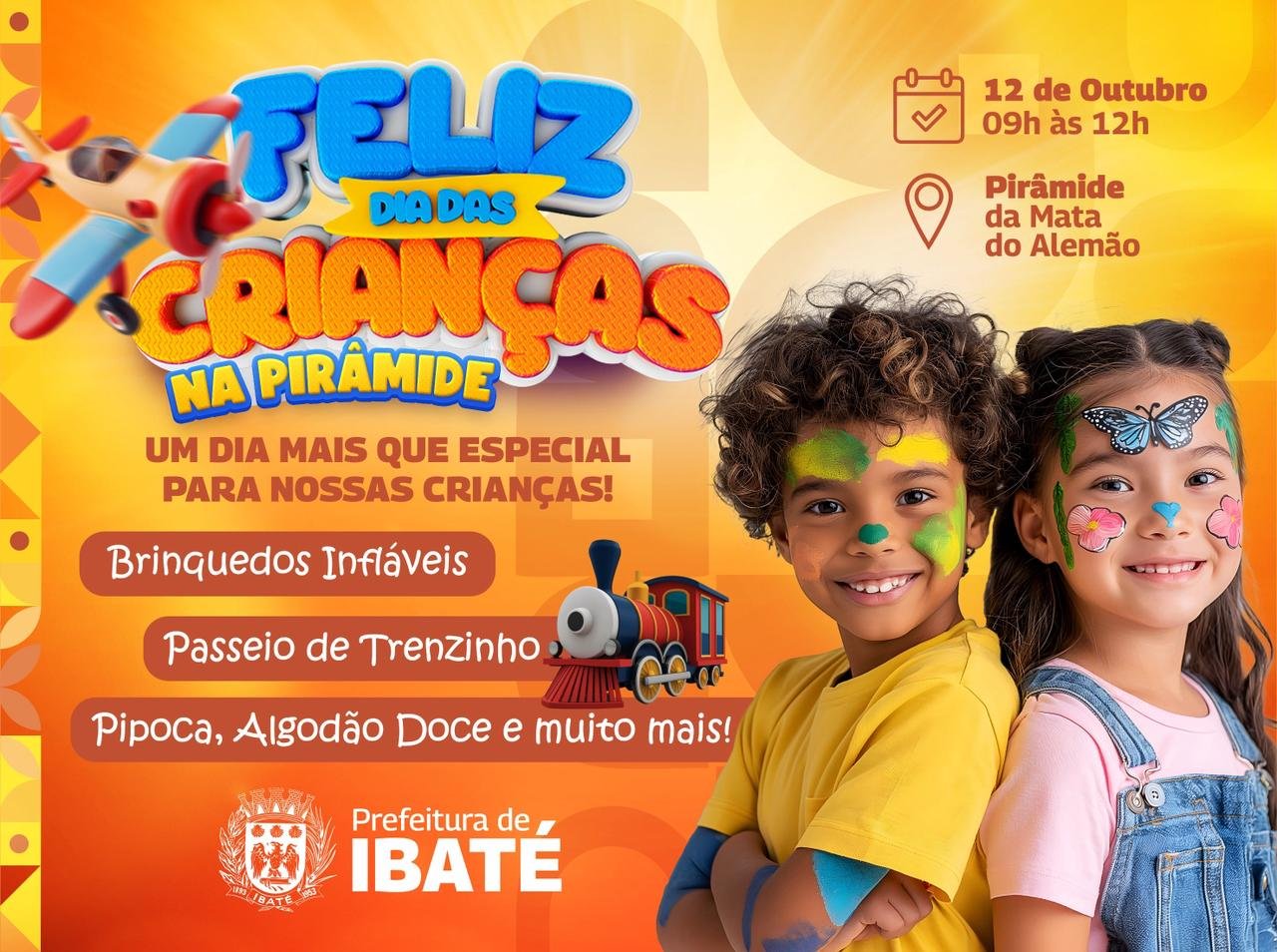 Neste domingo, 12 de outubro, a Prefeitura Municipal de Ibaté promove uma manhã especial em comemoração ao Dia das Crianças, com muita diversão e atividades gratuitas para toda a família.