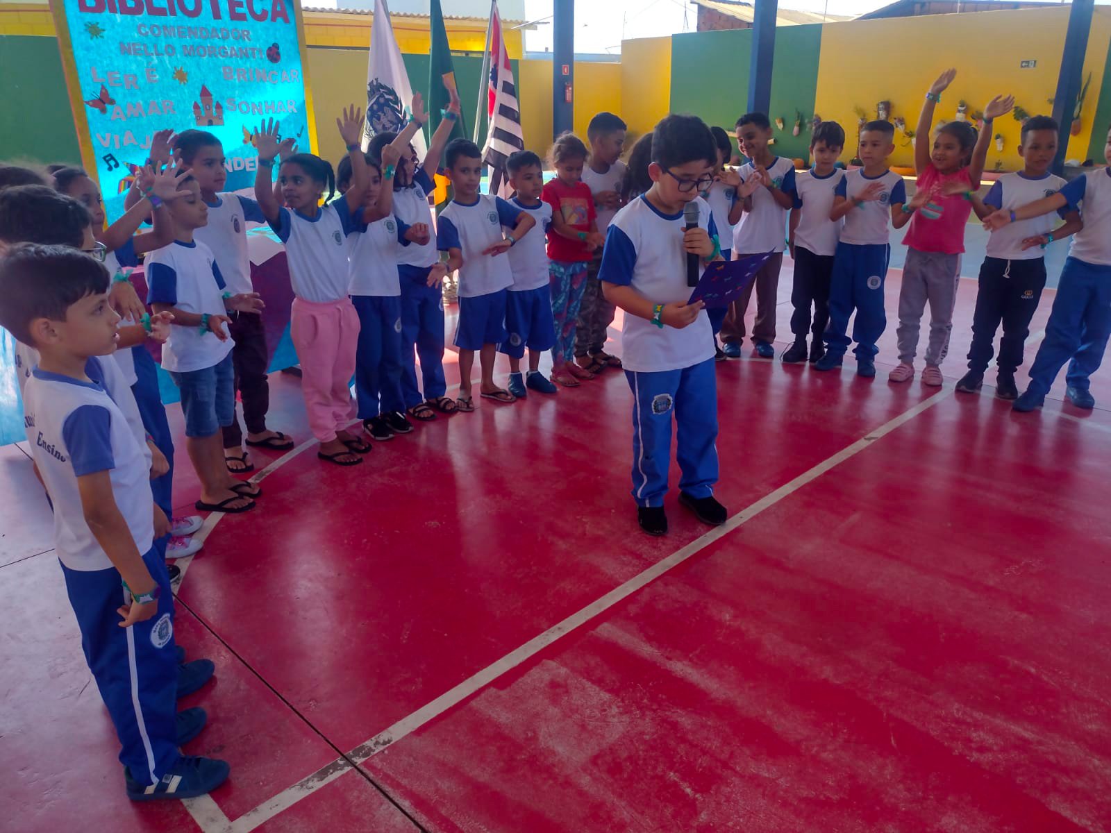 A Equipe da EM Profª Alice Rossito Cervoni realizou uma cerimônia homenageando os alunos nota 10 do 2º bimestre. Para ilustrar a ocasião, alguns alunos de cada turma fizeram uma leitura para os ilustres colegas ganhadores do prêmio.