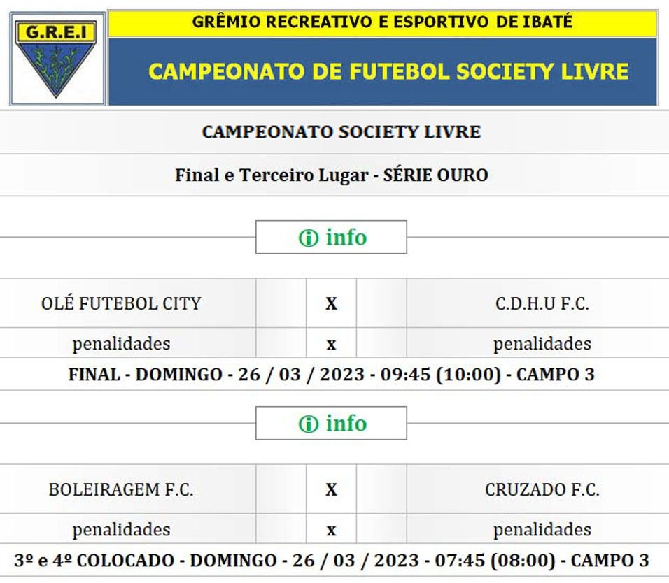 Acontece neste domingo (26) no Grêmio Recreativo Esportivo Ibaté (GREI) , as finais do campeonato Society livre, na série ouro a disputa do terceiro lugar acontece entre as equipes do Boleiragem FC X Cruzado FC a partir das 7h45 e a grande final será entre o Olé Futebol City x C.D.H.U.F.C ás 9h45.